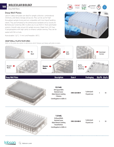 labcon.com100Deep Well Plate Description Item # Packaging Qty/Pk Qty/Cs0.2 mL 384 Square WellsNotched CornerAlpha Numeric LabelingV BottomCentrifugation to 4,000 x G3904-520-000-9 5 plates/pack10 packs/case 5 501.0 mL 96 Round WellsNotched CornerAlpha Numeric LabelingRound BottomCentrifugation to 4,000 x G3903-520-000-9 5 plates/pack10 packs/case 5 50MOLECULAR BIOLOGYDeep Well PlatesNotched Corner384 Well96 WellDeep Well PlatesLabcon's deep well plates are ideal for sample collection, combinatorial chemistry, and library storage and access. They can be use for high throughput sample mixing and are compatible with most liquid handling robots. They are formatted to the dimensional standards set by Society for Biomolecular Screening (SBS) to allow you to use them in most automated systems. Smooth sides ensure full sample recovery. Made from USP Class VI polypropylene with high clarity to enhance sample viewing. They can be sealed with film or mats. Autoclavable (122%u00b0C, 15 min) and freezable (-80%u00b0C). DEEP WELL PLATE FEATURES Refer to the plate description to determine which feature each deep well plate includes.Square WellsRound Wells%u2122 %u2122 %u2122 %u2122 %u2122 -80%u00b0 CCertified Low TraceMetals%u2122 CERTIFIEDLow TraceMETALSAlpha Numeric Labeling