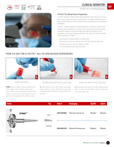 The Earth Friendly%u00ae Company 107%u00ae Pette Tip Item # Packaging Qty/Pk Qty/Cs7620-540-000-9 100 per box/1 box per case 100 pettes 100 pettes7620-500-010-9 100 per box/5 boxes per case 100 pettes 500 pettesCLINICAL CHEMISTRY H-Pette%u2122 All-In-One Blood DispenserH-Pette%u2122 for Blood Smear PreparationH-Pette%u2122 dispenser makes blood slide preparation safe and easy. Since you don%u2019t have to open the primary sample tube, you greatly reduce the risk of lab-acquired infection by minimizing aerosols and exposure to blood borne pathogens. H-Pette%u2122 simplifies blood smear preparation by cutting out several steps, thereby improving efficiency, saving time, and reducing wasted materials and blood samples. Using the H-Pette eliminates the need for sticks, capillaries, or syringes to dispense blood on the slide. No need for special training, fittings, or inserts.STEP 1: Insert H-Pette's cannula into the center of the stopper of the collection tube. Gently press until the cannula completely penetrates the septum. (The cannula is to be inserted in existing puncture in the stopper of the collection tube). 2. Invert collection tube with H-Pette's round edge pointing down, as shown. Gently press round edge to the glass slide to dispense one blood drop onto the slide.%u2022 Easy delivery of blood sample to a glass slide%u2022 Minimizes aerosols and reduces the risk of lab-acquired infections%u2022 No special training, special fittings or inserts%u2022 Fits all standard blood collection tubes3. Rotate tube at an angle with H-Pette's blade pointed down, as shown. Use the blade to make a smear just as you would a glass slide.INSERT AND PRESS DISPENSE ONE DROP ONTO GLASS SLIDE SMEAR THE DROP ACROSS THE SLIDEHOW TO USE THE H-PETTE%u2122 ALL-IN-ONE BLOOD DISPENSERSBeveled TipAcrylic1 2 3%u2122 %u2122 %u2122 %u2122 Certified Low TraceMetals%u2122 CERTIFIEDLow TraceMETALSH-Pette%u2122