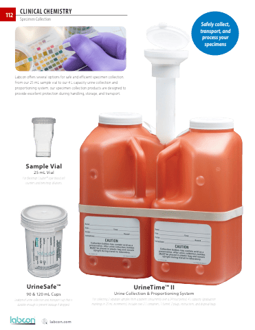labcon.com112Labcon offers several options for safe and efficient specimen collection. From our 25 mL sample vial to our 4 L capacity urine collection and proportioning system, our specimen collection products are designed to provide excellent protection during handling, storage, and transport.CLINICAL CHEMISTRYSpecimen CollectionUrineTime%u2122 II Urine Collection & Proportioning System For collecting 2 separate samples from a patient concurrently over a 24 hour period. 4 L capacity (graduation markings in 25 mL increments). Includes two 2 L containers, 1 funnel, 2 plugs, instructions, and disposal bags.Sample Vial25 mL VialFor Beckman Coulter%u00ae style blood cell counters and benchtop dilutions.Safely collect, transport, and process your specimensUrineSafe%u212290 & 120 mL CupsLeakproof urine collection and transport cup that is durable enough to prevent leakage if dropped.