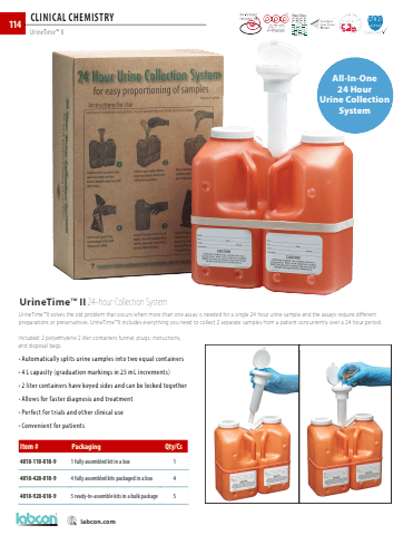 labcon.com labcon.com114CLINICAL CHEMISTRYUrineTime%u2122 IIIncluded: 2 polyethylene 2 liter containers funnel, plugs, instructions, and disposal bags. UrineTime%u2122 II 24-hour Collection SystemItem # Packaging Qty/Cs4010-110-010-9 1 fully assembled kit in a box 14010-420-010-9 4 fully assembled kits packaged in a box 44010-920-010-9 5 ready-to-assemble kits in a bulk package 5UrineTime%u2122II solves the old problem that occurs when more than one assay is needed for a single 24 hour urine sample and the assays require different preparations or preservatives. UrineTime%u2122II includes everything you need to collect 2 separate samples from a patient concurrently over a 24 hour period.%u2022 Automatically splits urine samples into two equal containers%u2022 4 L capacity (graduation markings in 25 mL increments)%u2022 2 liter containers have keyed sides and can be locked together%u2022 Allows for faster diagnosis and treatment%u2022 Perfect for trials and other clinical use%u2022 Convenient for patientsAll-In-One 24 Hour Urine Collection System