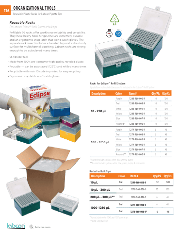 labcon.com116Description Color Item # Qty/Pk Qty/Cs10 - 250 %u00b5LPurple 1280-960-006-9 10 100Teal 1280-960-008-9 10 100White 1280-960-001-9 10 100Yellow 1280-960-002-9 10 100Blue 1280-960-007-9 10 100Assorted* 1280-969-000-9 10 100100 - 1250 %u00b5LPurple 1279-960-006-9 6 48Teal 1279-960-008-9 6 48White 1279-960-001-9 6 48Yellow 1279-960-002-9 6 48Blue 1279-960-007-9 6 48Assorted** 1279-969-000-9 6 48Reusable RacksFor Labcon's Eclipse%u2122 Refill System or bulk tipsRefillable 96 racks offer workhorse reliability and versatility. They have heavy hook hinges that are extremely durable and an ergonomic snap latch that won%u2019t catch gloves. The separate rack insert includes a beveled top and extra sturdy surface for multichannel pipetting. Labcon racks are strong enough to be autoclaved many times.Racks For Bulk TipsRacks For Eclipse%u2122 Refill SystemTip platform not included because it is included in the Eclipse%u2122 Refill SystemORGANIZATIONAL TOOLSReusable Plastic Racks for Labcon Pipette TipsDescription Color Item # Qty/Pk Qty/Cs10 %u00b5L Teal 1299-960-038-9 12 12010 %u00b5L - 300 %u00b5L Teal 1210-960-008-9 10 100200 %u00b5L - 300 %u00b5L** Teal 1276-960-008-9 6 481000-1250 %u00b5LTeal 1277-960-008-9 6 48Teal 1278-960-008-9* 6 48*Assorted includes: yellow, white, blue, green & purple**Assorted includes: yellow, white, blue, green, purple, & extra white* Raised platform for 1045 and 1057 pipette tips** Extra Long Bulk Tips%u2122 %u2122 -80%u00b0 C%u2022 96 tips per rack %u2022 Made from 100% pre-consumer high quality recycled plastic %u2022 Reusable %u2014 can be autoclaved (122%u00b0C) and refilled many times%u2022 Recyclable with resin ID code imprinted for easy recycling%u2022 Ergonomic snap latch won't catch gloves
