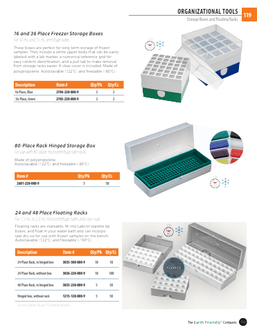 The Earth Friendly%u00ae Company 119%u00aeORGANIZATIONAL TOOLSStorage Boxes and Floating Racks Description Item # Qty/Pk Qty/Cs16-Place, Blue 2704-220-000-9 2 2 36-Place, Green 2703-220-000-9 2 280-Place Rack Hinged Storage BoxFor use with 80-place microcentrifuge tube racksMade of polypropylene. Autoclavable (122%u00b0C) and freezable (-80%u00b0C). Item # Qty/Pk Qty/Cs2601-220-000-9 5 5016 and 36 Place Freezer Storage Boxes For 50 mL and 15 mL centrifuge tubesThese boxes are perfect for long term storage of frozen samples. They include a white upper body that can be easily labeled with a lab marker, a numerical reference grid for easy content identification, and a pull tab to make removal from storage racks easier. A clear cover is included. Made of polypropylene. Autoclavable (122%u00b0C) and freezable (-80%u00b0C).24 and 48 Place Floating RacksFor 1.5 mL or 2.0 mL microcentrifuge tubes and cryo-vialsFloating racks are stackable, fit into Labcon pipette tip boxes, and float in your water bath and can incorporate dry ice for use with frozen samples on the bench. Autoclavable (122%u00b0C) and freezable (-190%u00b0C). Fits into Labcon 96 and 192 pipette tip racks Description Item # Qty/Pk Qty/Cs 24 Place Rack, in hinged box 3035-500-000-9 10 10 24 Place Rack, without box 3036-220-000-9 10 100 48 Place Rack, in hinged box 3035-230-000-9 5 50 Hinged box, without rack 1215-120-000-9 5 50