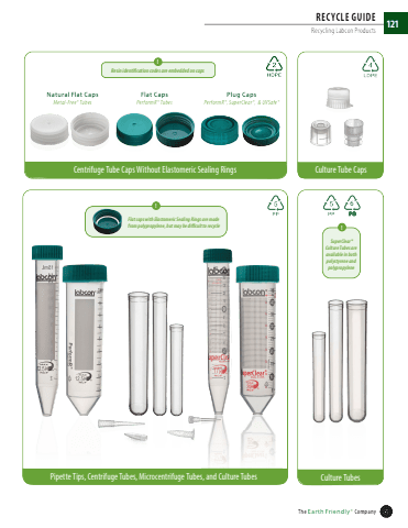 The Earth Friendly%u00ae Company 121%u00aePipette Tips, Centrifuge Tubes, Microcentrifuge Tubes, and Culture TubesCentrifuge Tube Caps Without Elastomeric Sealing Rings Culture Tube CapsCulture Tubes6PSFlat caps with Elastomeric Sealing Rings are made from polypropylene, but may be difficult to recycle!Natural Flat CapsMetal-Free%u00ae TubesFlat CapsPerformR%u00ae TubesPlug CapsPerformR%u00ae, SuperClear%u00ae, & UVSafe%u00ae! SuperClear%u00ae Culture Tubes are available in both polystyrene and polypropyleneRECYCLE GUIDERecycling Labcon Products!Resin identification codes are embedded on caps