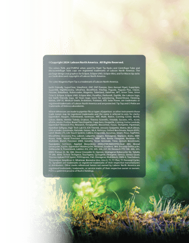 %u00a9Copyright 2024 Labcon North America. All Rights Reserved.The colors TEAL and PURPLE when used for Pipet Tip Racks and Centrifuge Tube and Microcentrifuge Tube caps are registered trademarks of Labcon North America. The package design and graphics for Eclipse, Eclipse UNO, Eclipse Mini, and for Macro tip racks are trade dress and copyrights of Labcon North America.The color Magenta Pipet Tip is a trademark of Labcon North America.Earth Friendly, SuperClear, ViewPoint, ZAP, ZAP Premier, Zero Aerosol Pipet, SuperSpin, SuperSlik, HighRecovery, UltraFine, BevelPoint, FlexTop, Pagoda, Pagoda Plus, Classic, Premier, RoboRack, RoboLoader, Magenta, TubeGard, GateFree, APT, Urine Time, Urine Time II, Eclipse, Eclipse UNO, Eclipse Mini, PurePlus, PerformR, ZapSlik, the Labcon logo, the Earth Friendly logo, 50 Years logo, icons for autoclaving, Rnase/Dnase, Freezing, Metals, USP VI, Medical Grade, Endotoxin, Protease, ATP, Solar Power, are trademarks or registered trademarks of Labcon North America and are protected. Tip Top and C-Pette are trademarks of Helena Laboratories.Where references are made to pipettor fits or types of pipettors or other instruments those trade names may be registered trademarks and the name is referred to only for clarity. Eppendorf, Axygen, Fisherbrand, Sorenson, ART, Multi, Rainin, Corning Costar, Biohit, Gilson, Matrix, Mettler Toledo, Ovation, Thermo Scientific, Vistalab, Socorex, HTL, eLine, ePette, mLine, Proline, Brand Transferpette, Capp Aero, Onepette, Corning Costar Lambda, Eppendorf Research Pro, Research, Finnpipette, Biocontrol, Focus, Techpette, Pipetman, Hamilton Softgrip, High Tech Lab V3, ICN Titertek, Jencons Sealpette, Matrix, MLA Ultron, USA uLeader, Genemate, Ratiolab, Genex, MLA, Nichiryo, Oxford Benchmate, Rainin EDP2, Latch Mode, LTS, Lite Touch System, Calibra, Dragonlab, Accumax, Smart, Picus, TopPette, MicroPette, Discovery Pro, Labnet, Labpette, Qiagen, Rotorgene, Neptune, Biotix, MBP, Acura, Volac, World Precision Instruments, MBP Fine, Rainin Finepoint, Beckman FX, Multimek, Biotek Precision 2000, Genetix, Tecan Genmate, Timo, Zymark Benchmate, Rapidplate, SciClone, Applied Biosystems 2400,2700,9600,9700,Dual 384, Biorad Genecycler, Icycler, Eppendorf Mastercycler, Personal, Gradient, 384, Ericomp Deltacycler, Deltacycler II, Powerblock, Labline 212, 214, 225, 226, 227, MJ Research PTC-100, 200, 225, MWG Primus 25, 96, 384, Oncor Crocodile III, Operon, Stratagene Robocycler 96, TaKaRa TP-240, 3000, Techne Techgene, Touchgene, Cyclogene, Flexigene, Genius, Genius Quad, Thermo Hybaid PCR Sprint, PCR Express, PxE, Omnigene, Multiblock, OMN-E, Touchdown, Thermolyne Amplitron II, Whatman Biometra Uno, Uno II, T1, T1 Plus, T1 Personal Cycler, T3, Tgradient are trademarks or registered trademarks of their respective manufacturers or distributors. Other marks referenced herein not owned by Labcon North America are registered trademarks, trademarks, or service marks of their respective owner or owners. PCR is a patented process of Roche Holdings.
